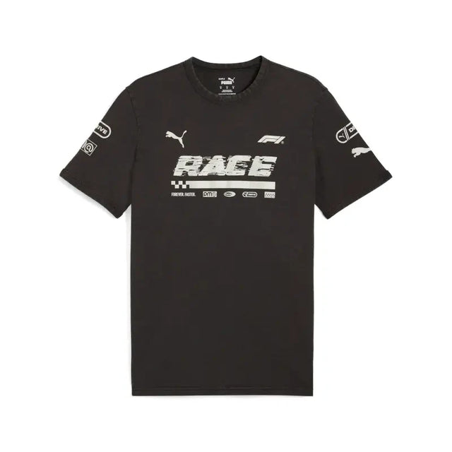 Celebrate 75 years of speed and adrenaline with this PUMA tee. Featuring a washed surface, rib collar and cuffs, and bold F1® and PUMA Cat logos, it's the ultimate blend of racing heritage and modern style. Get ready to stand out!