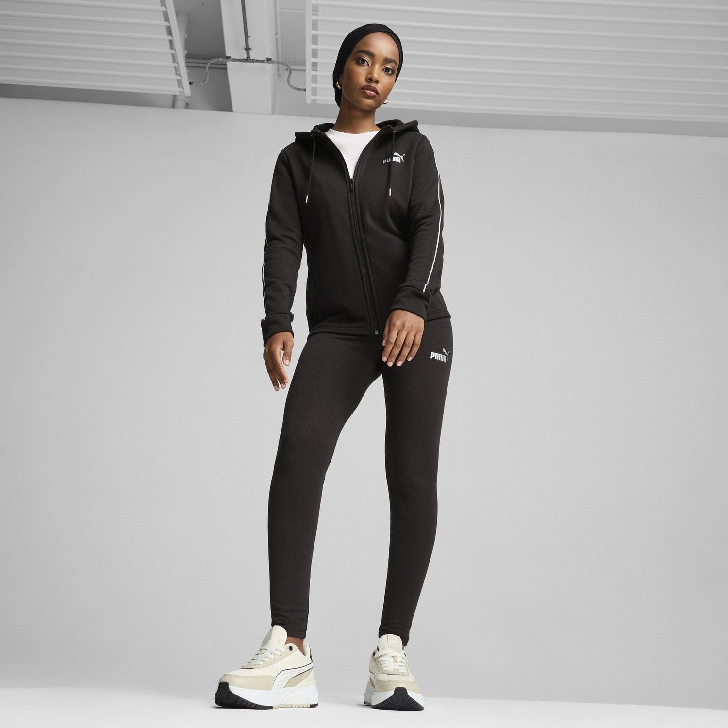- This women's tracksuit set includes a zip-up hoodie and matching pants, both featuring metallic accents. The hoodie has a drawstring hood and ribbed cuffs, while the pants offer a comfortable fit. The set is made from cotton, providing softness and breathability.