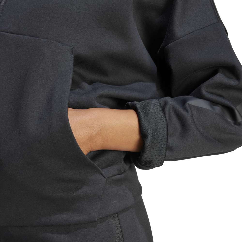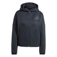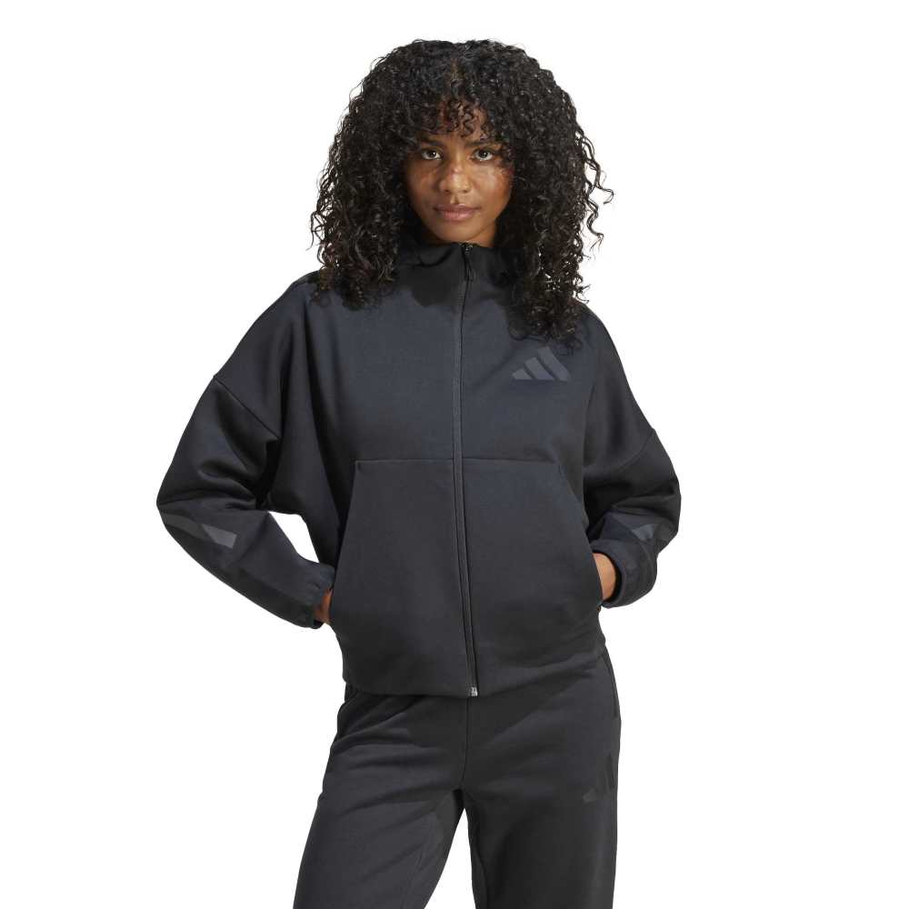 - Embrace the feeling of belonging and community with this adidas Z.N.E. full-zip hoodie designed for women. The loose-fit track top is knit from a sustainable blend of 57% recycled polyester and 43% cotton, designed for maximum warmth and dryness with a unique three-layer doubleknit spacer fabric. Featuring matte rubber prints inspired by iconic field lines, tech-inspired drawcords and zippers, it offers an effortless mix of style, comfort and positive vibes.